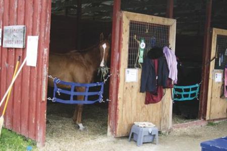 This equine beauty enjoys a munch while the rider is away from the stall. Riding coat, hat and award ribbon complete this portrait of riding excellence at Field Days 2010.