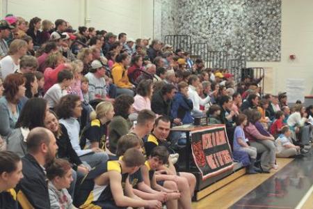 photo by Mike Cameron Part of huge crowd enjoying The Court Jesters Comedy Basket-ball Team who were entertaining on Friday night March 16th at the MUHS gym. The Middlebury Police Explorers have used the annual event as a successful fundraiser for 6 consecutive years.