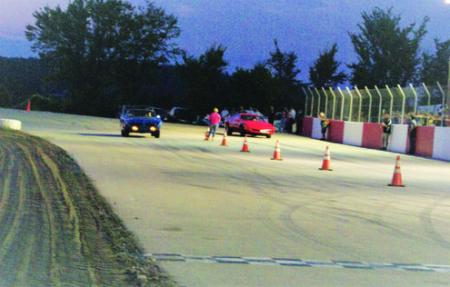Brian Goodro driving a Pontiac Firebird and Gary Payne driving a Plymouth Superbird at the starting line at Devil's Bowl Speedway.