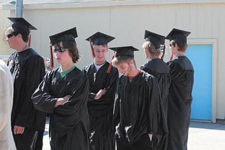 Grads share a light moment during 2008 MUHS graduation rehearsed at the Memorial Sports Center on Saturday June 14th, 2008.