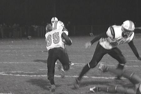 photo by Mike Cameron Middlebury halfback Ryan Foley finds some running room off a big block from teammate Riley Billings during Division II play-off game at Colchester on Friday night November 6th 2009. The Tigers spotted the Lakers 12-0 in the first half and were unable to close the gap in the second half. The Lakers via the win over Middlebury moved on to the D-II State Championship after holding off the Tigers strong second half come-back-bid 12-7.